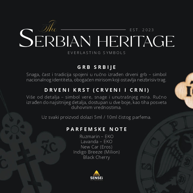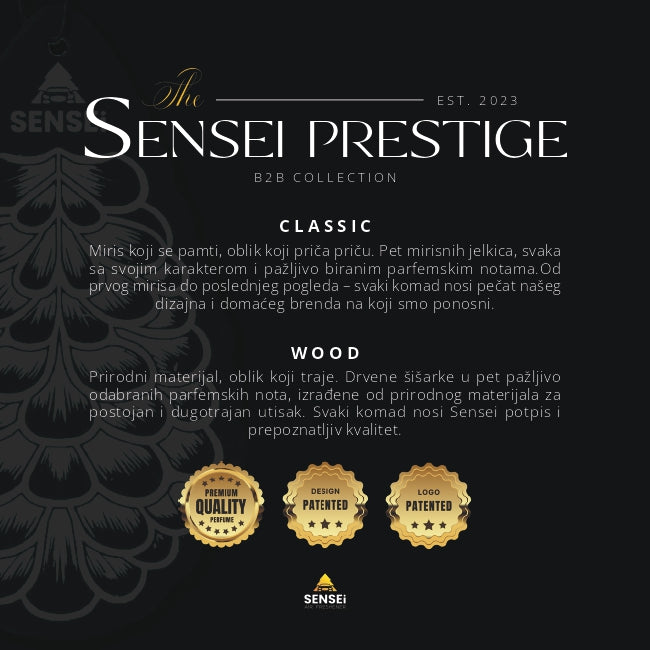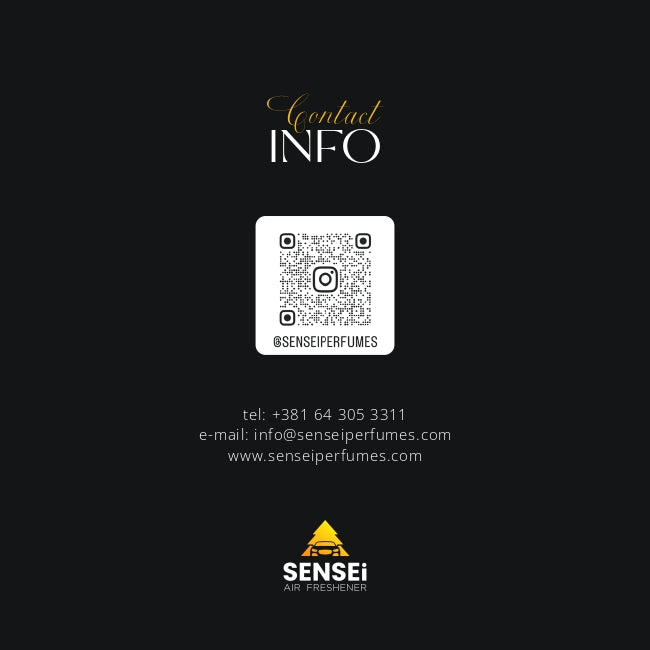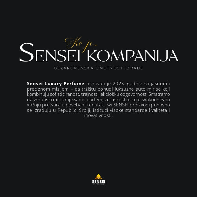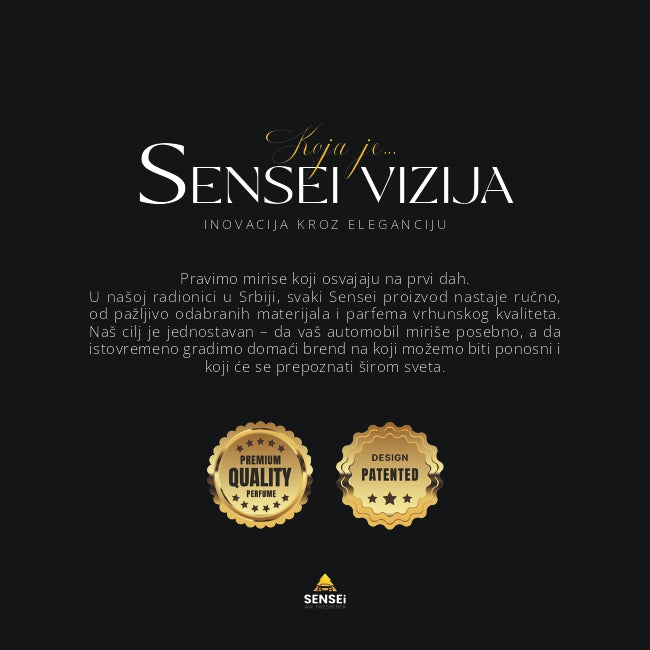 Sensei Air Freshener je brend nastao iz strasti prema autentičnim i luksuznim mirisima. Svaki proizvod ručno izrađujemo, koristeći ekološke materijale i premium parfeme, s ciljem da pružimo jedinstveno mirisno iskustvo. Naša misija je spajanje estetike, kvaliteta i ekološke održivosti, čime stvaramo proizvode koji nisu samo mirisi, već lični izraz svakog našeg korisnika.